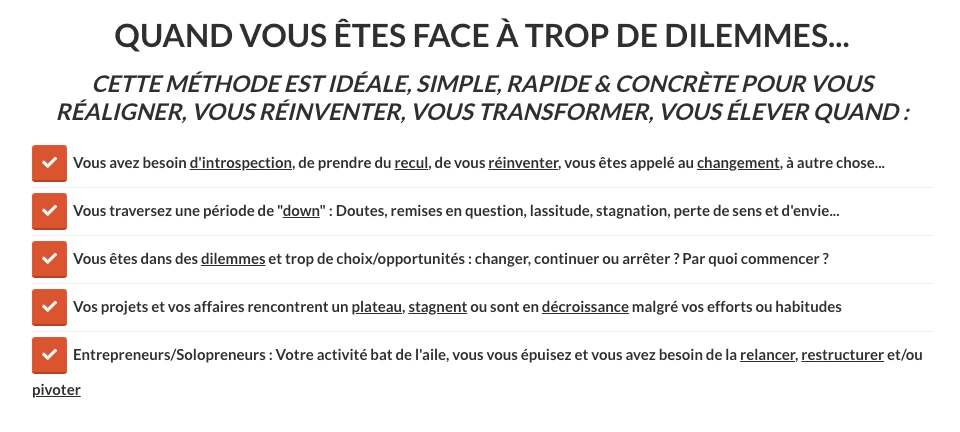 La méthode vous donne les questions, systèmes, modèles et outils afin de faire votre propre auto-coaching et auto-audit.